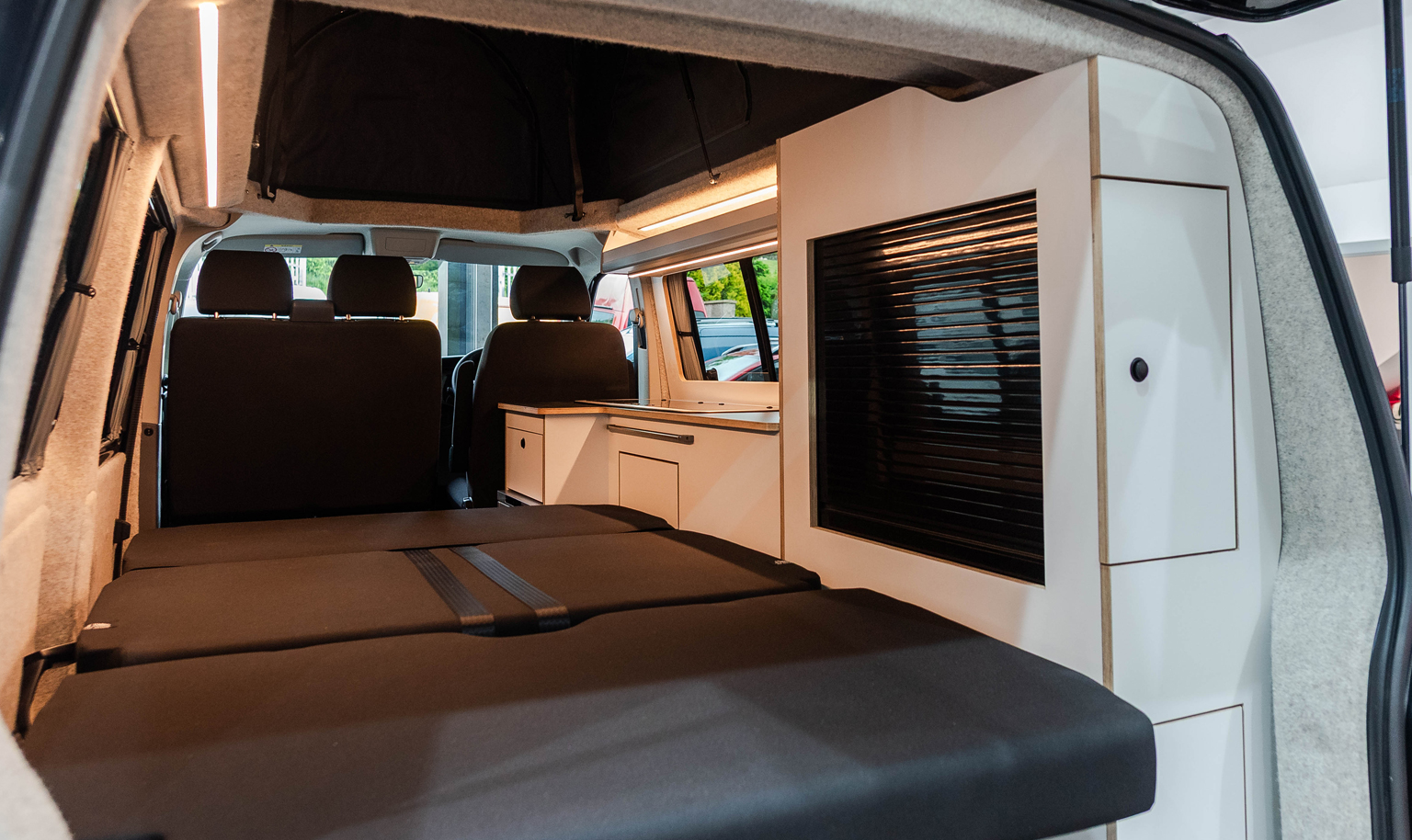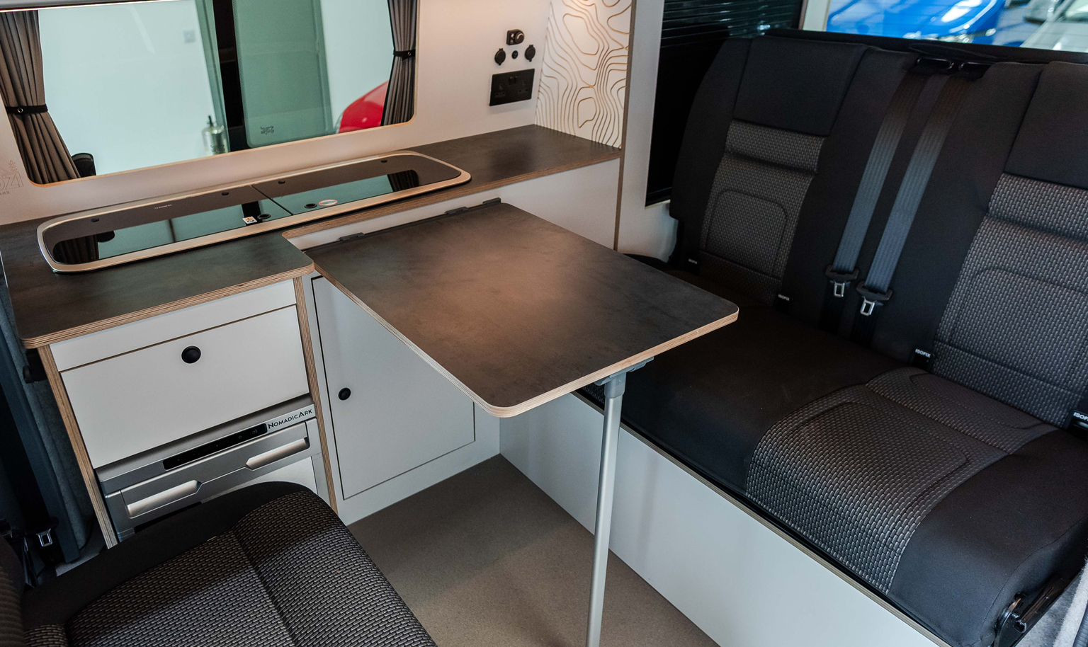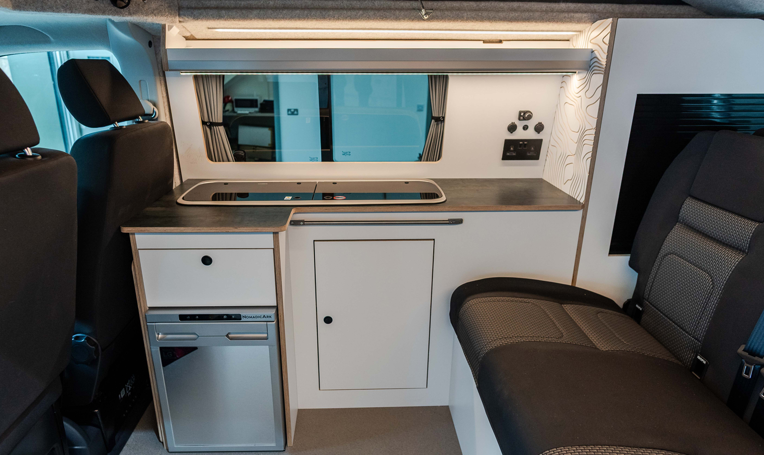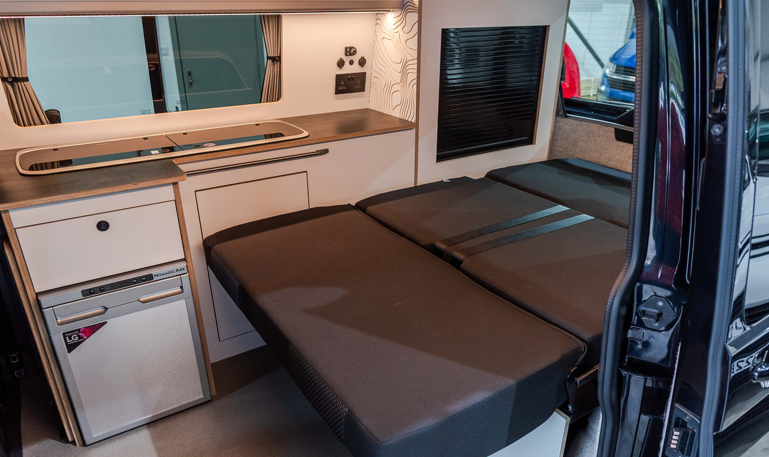• Cozi vans design run of units with wardrobe section at rear inc table, bed boards, splash back and led light shelf