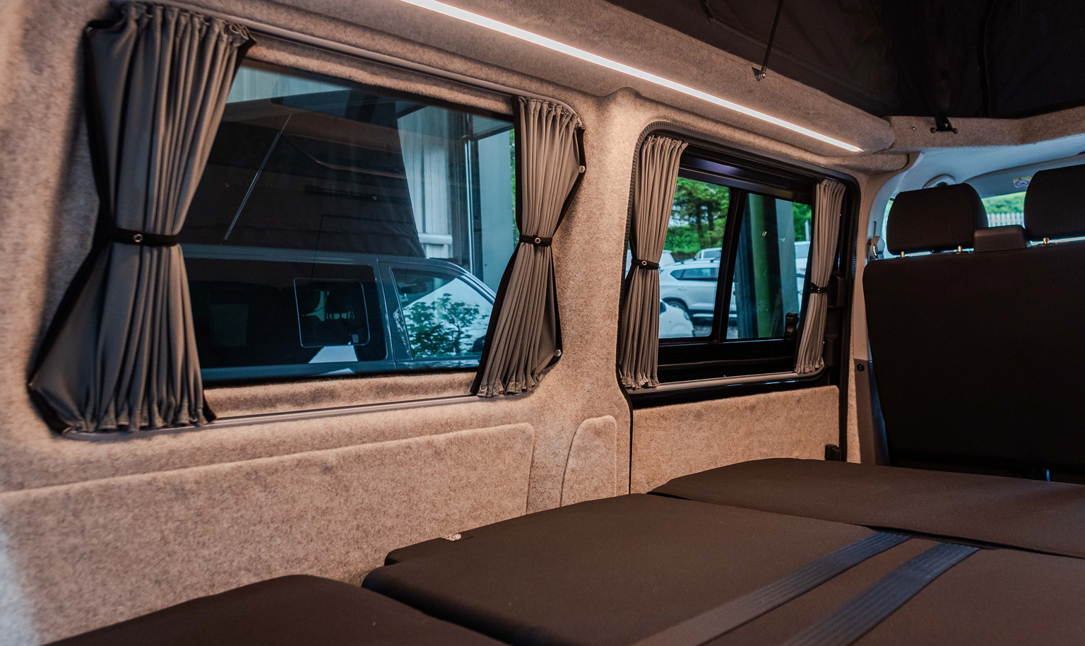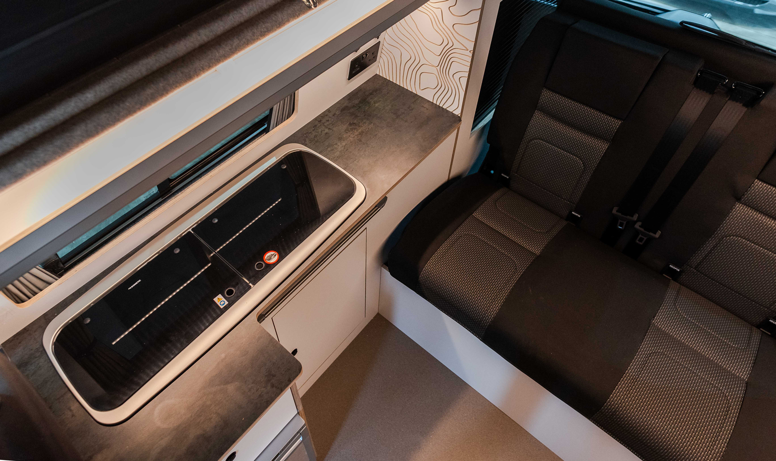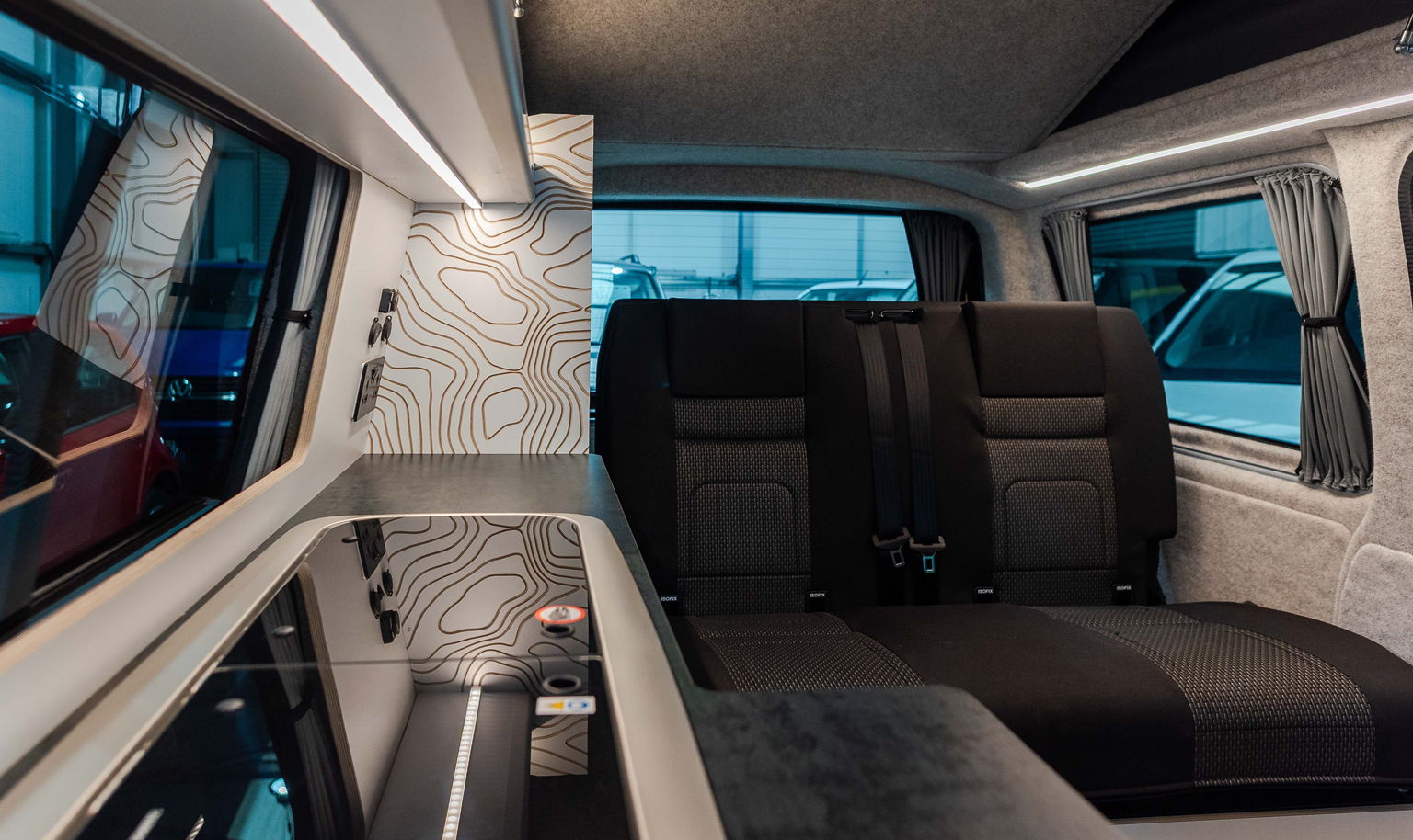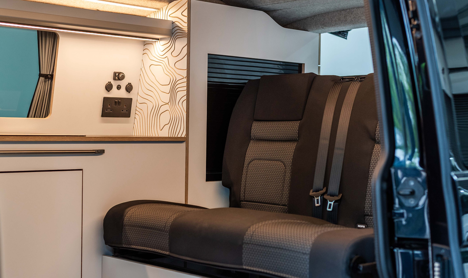 • Cozi vans design run of units with wardrobe section at rear inc table, bed boards, splash back and led light shelf