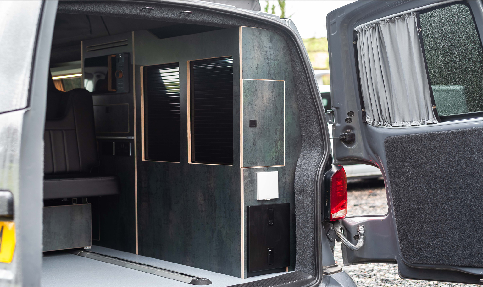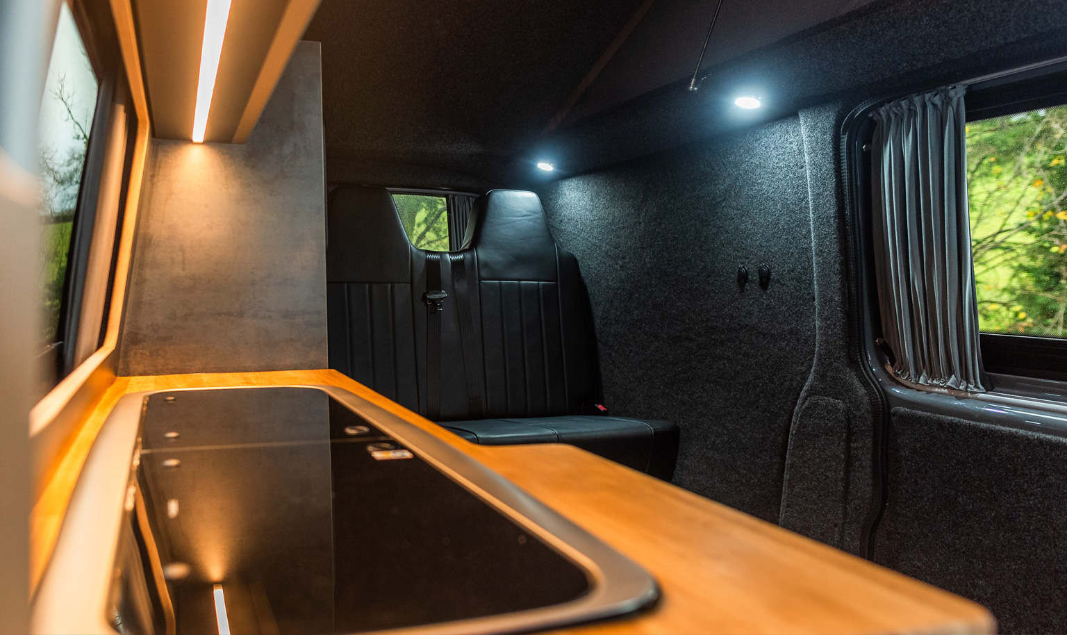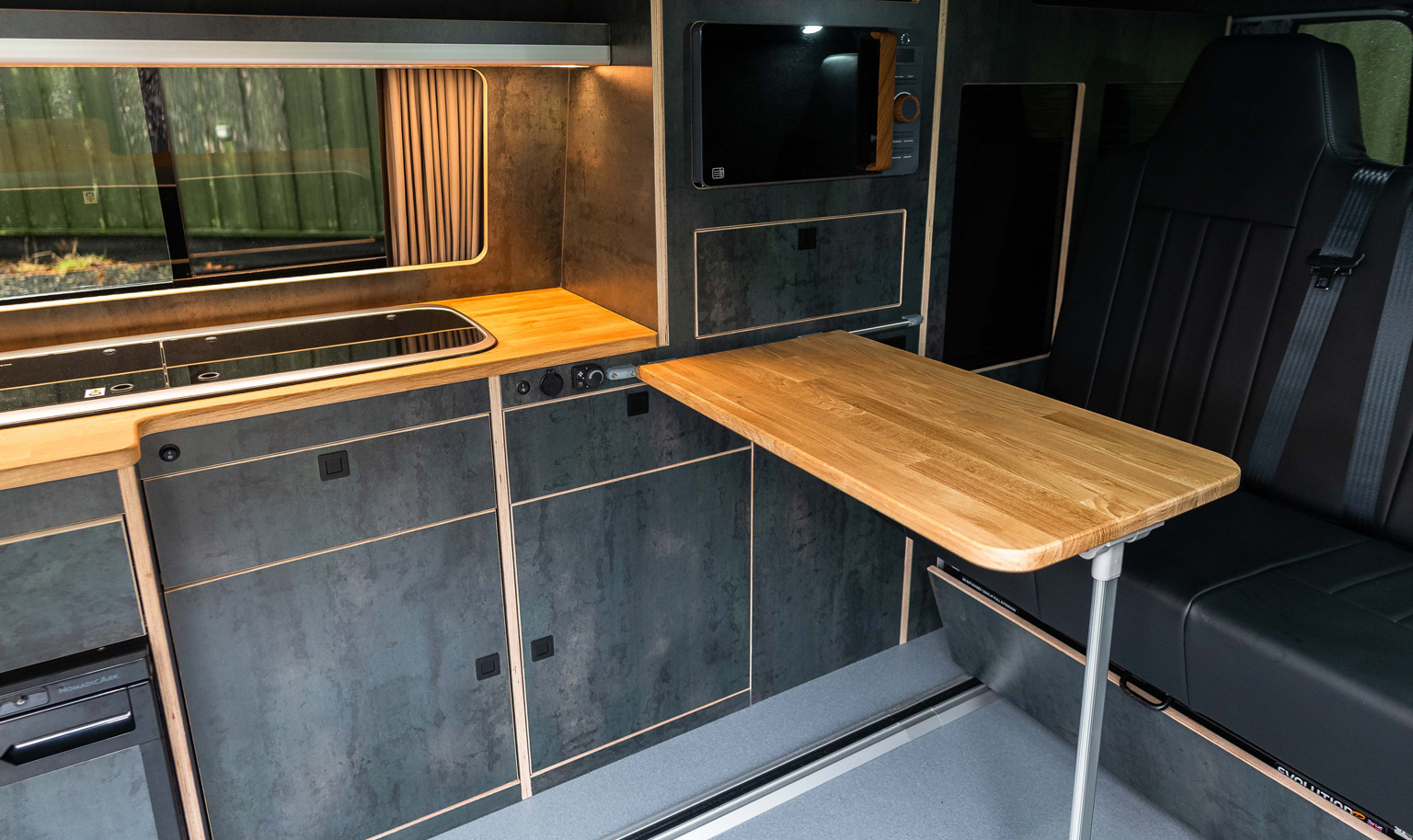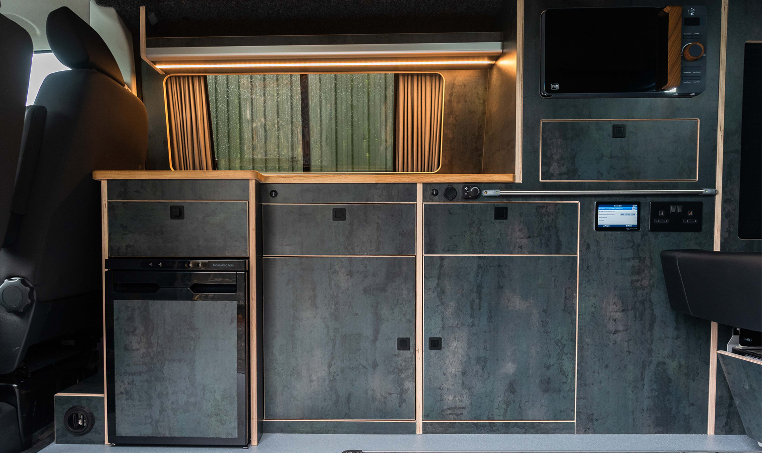 - Cozi vans design run of units with integrated wardrobe section at rear with extension to house high level microwave, inc removable table, bed boards, splash back and LED light shelf