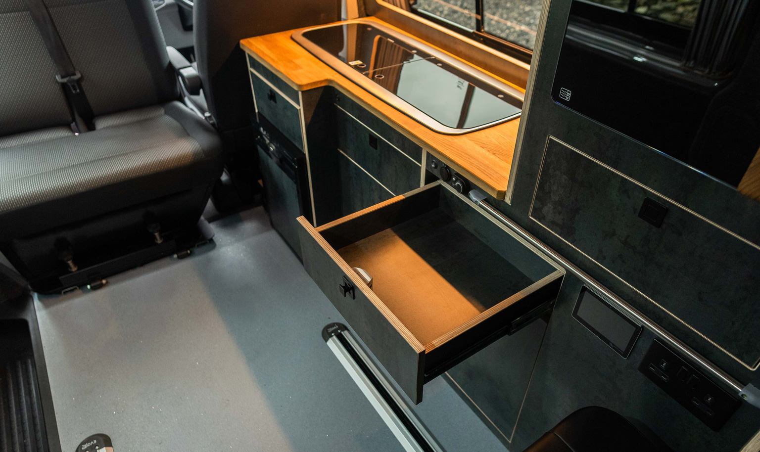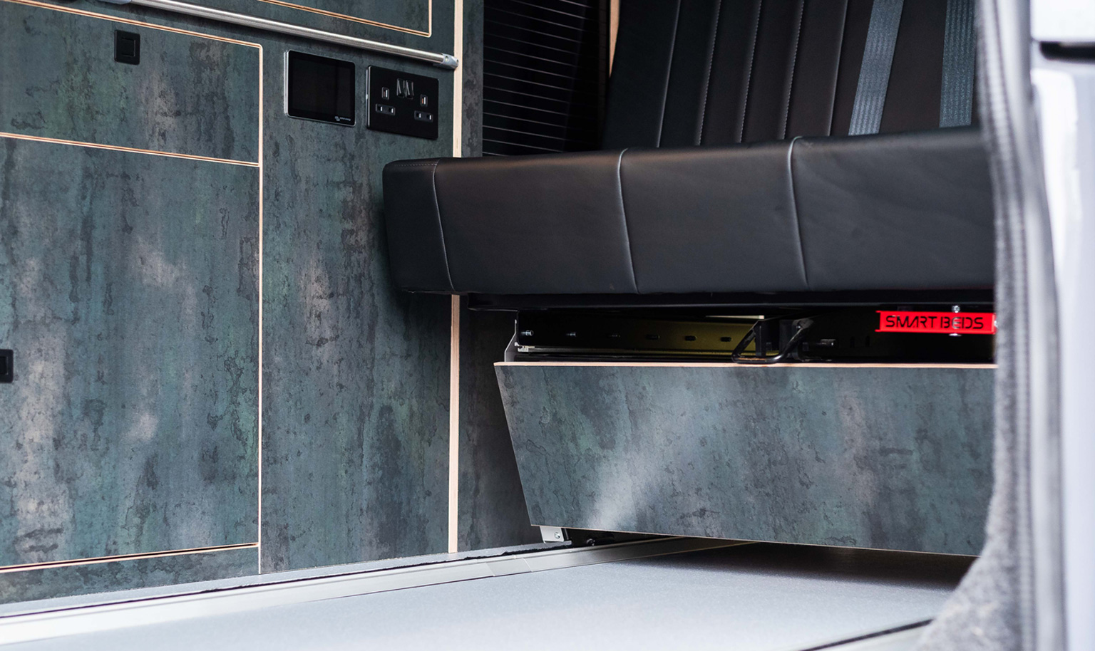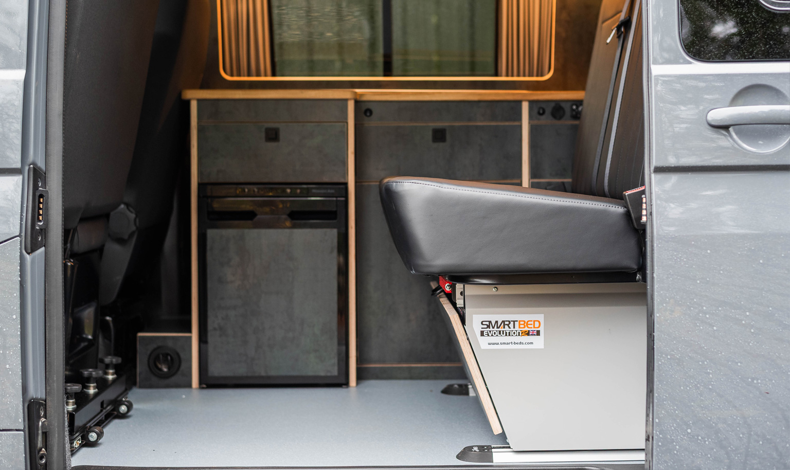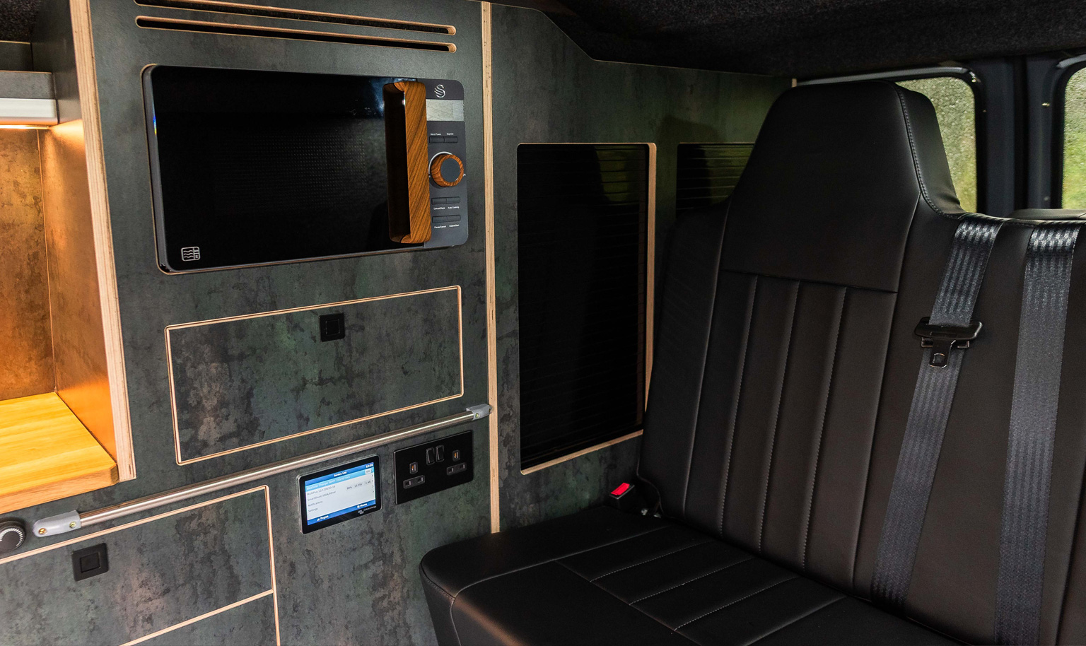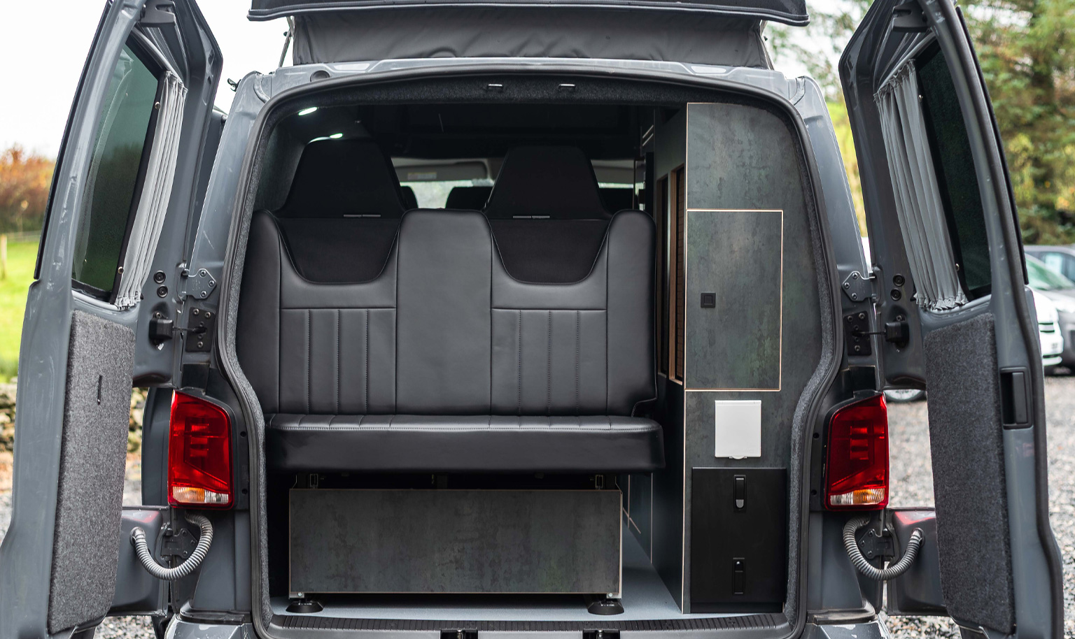 - Cozi vans design run of units with integrated wardrobe section at rear with extension to house high level microwave, inc removable table, bed boards, splash back and LED light shelf