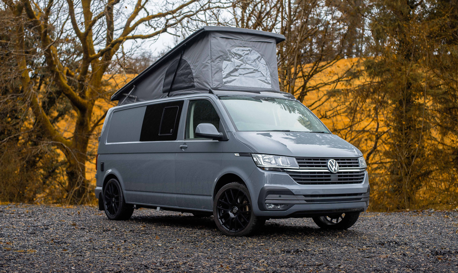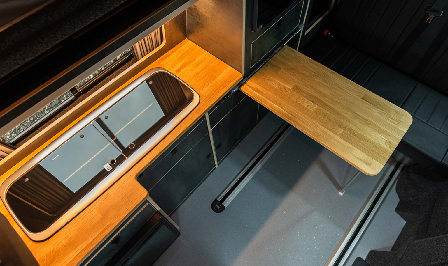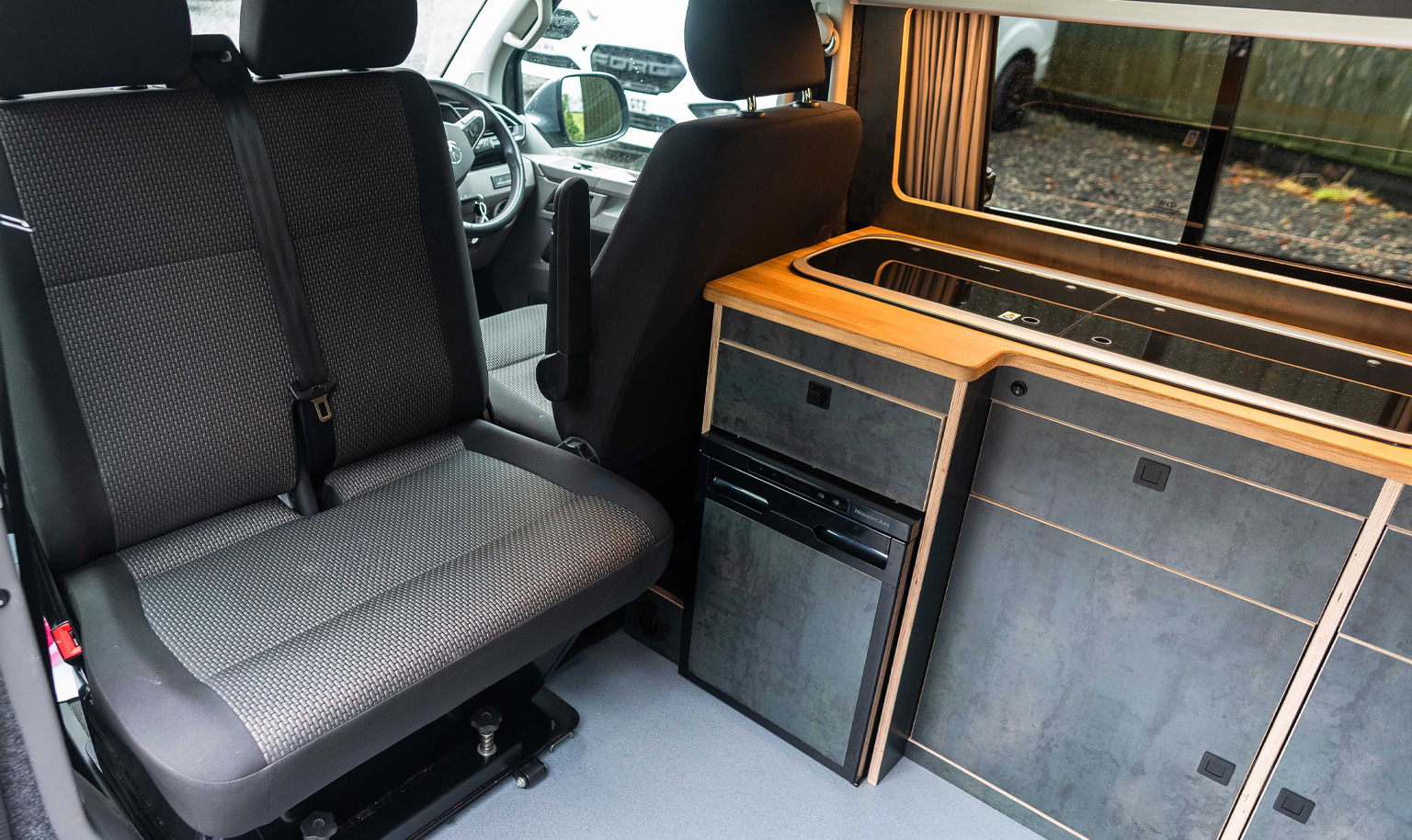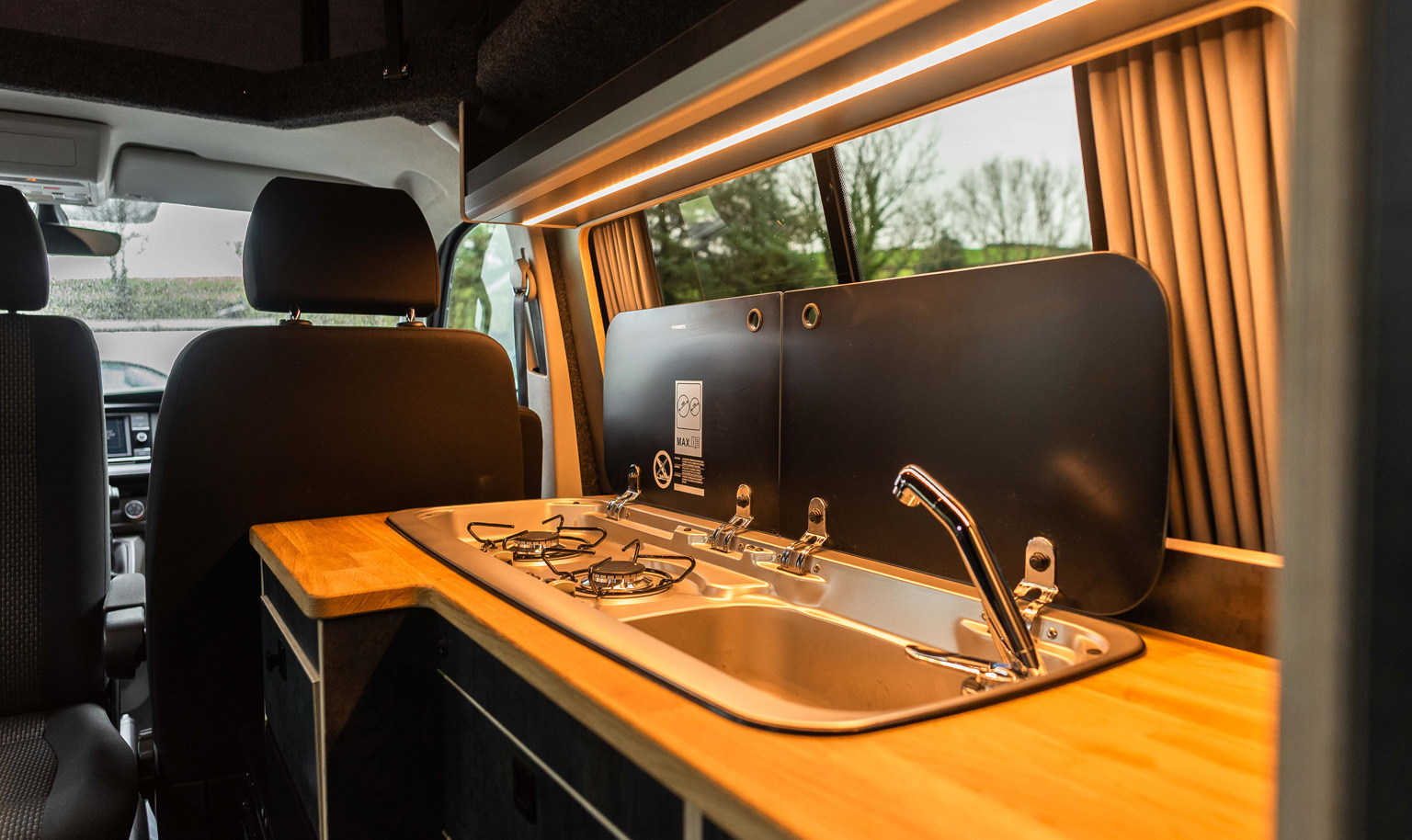 - Cozi vans design run of units with integrated wardrobe section at rear with extension to house high level microwave, inc removable table, bed boards, splash back and LED light shelf